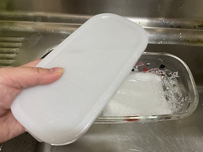 食後のタッパーやお弁当箱に水と食器用洗剤、ちぎった紙を少し入れて再び蓋をして数回振ります。
