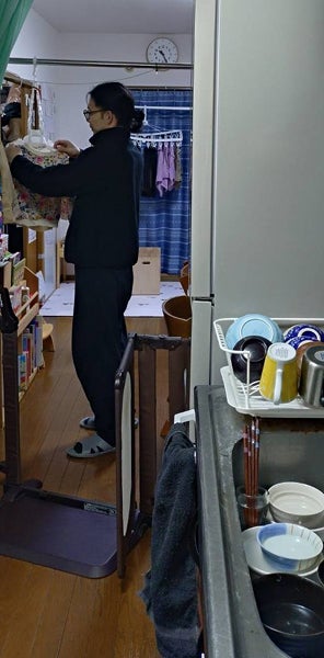 流し台には、これから洗う食器。その奥で、夫は洗濯物を干しています。別々の家事が、同時に進んでいる。この光景が、わが家の「とも家事」です。